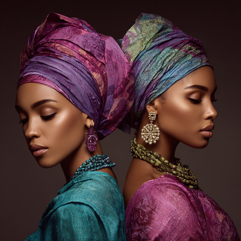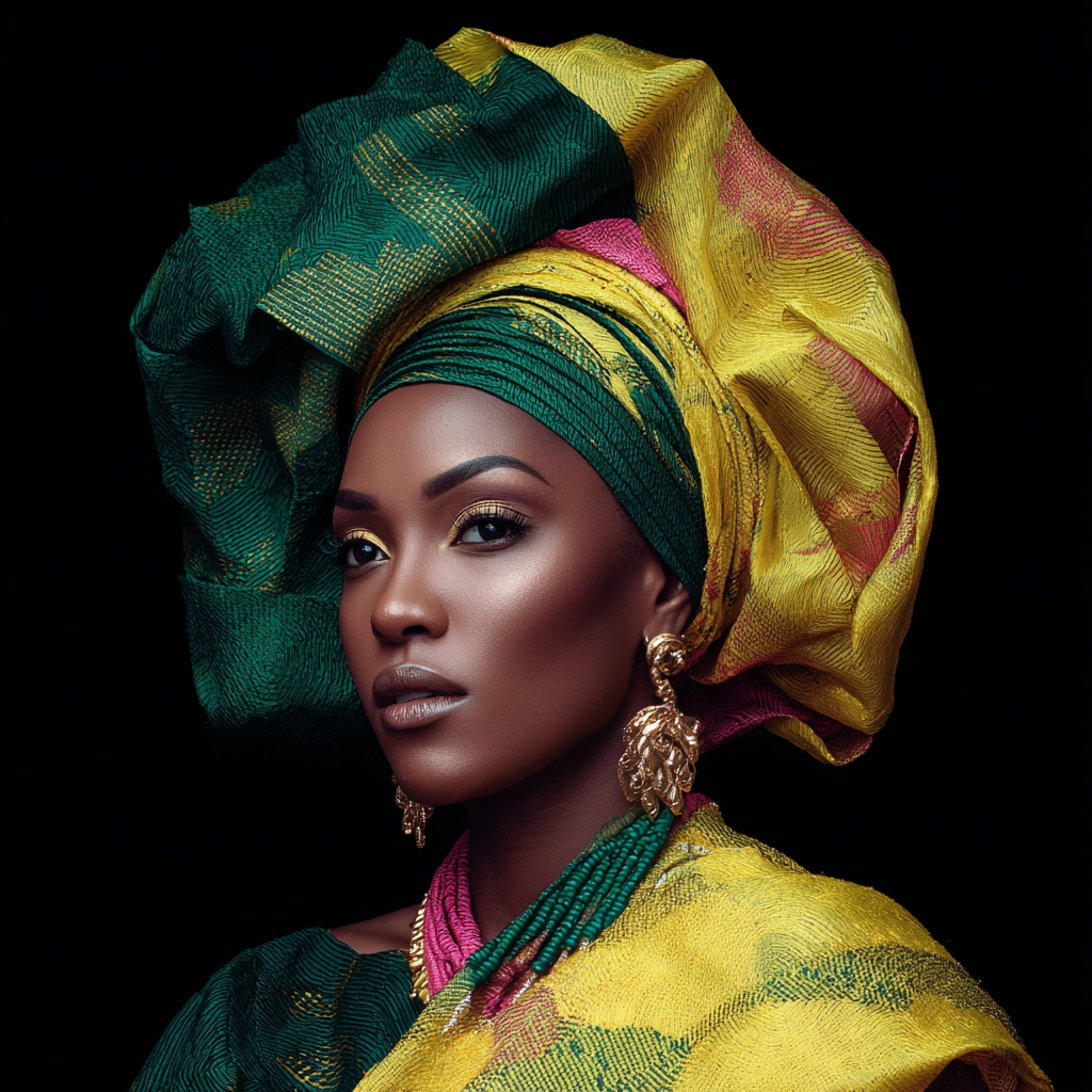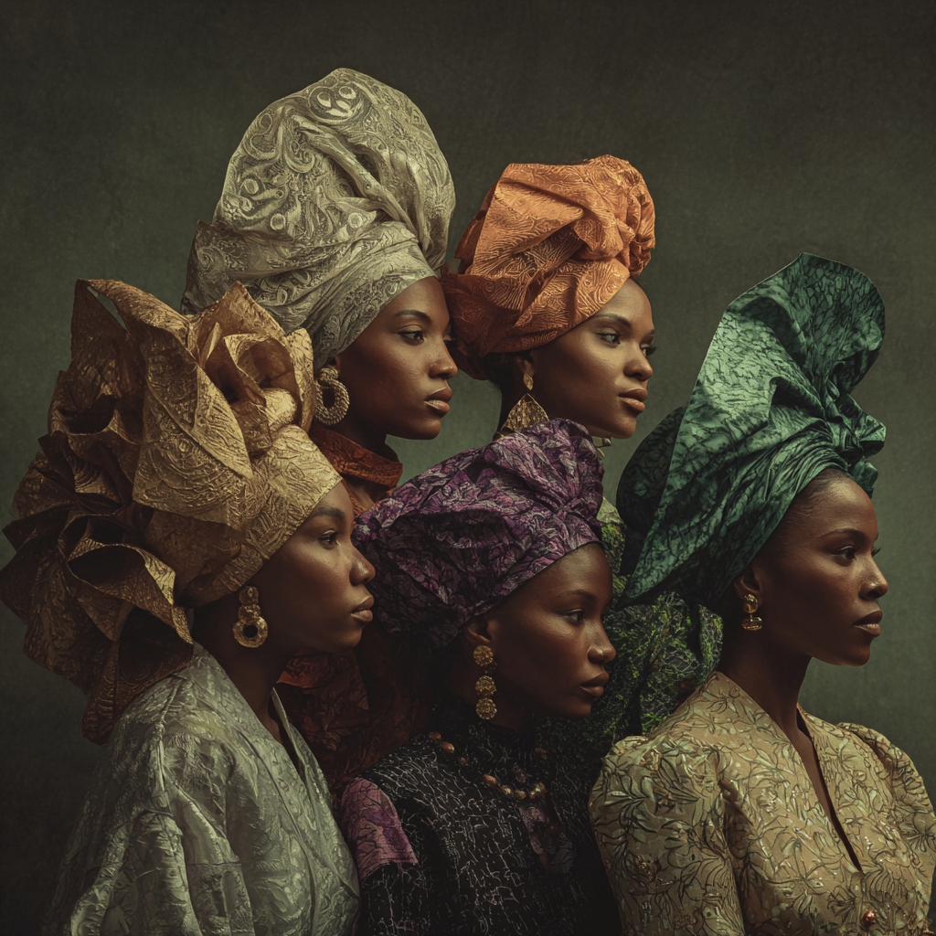 Intricate headwrap styles that echo centuries of trans-regional textile trade and shared coastal West African adornment practices.